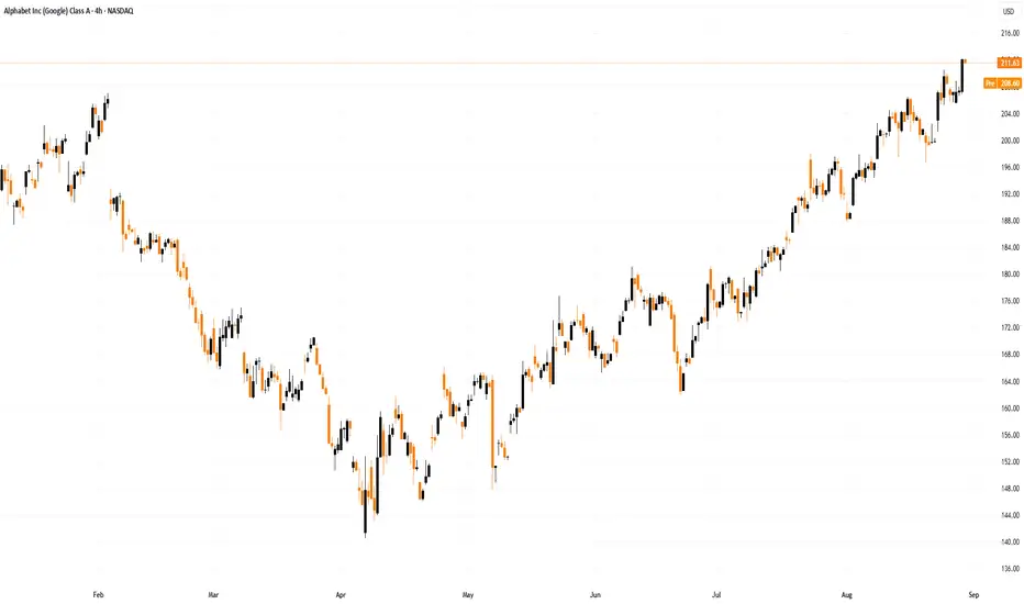 As the chart of Alphabet (GOOGL) shares shows, the price in August exceeded the February high. For the first time in history, the close price moved above $210.