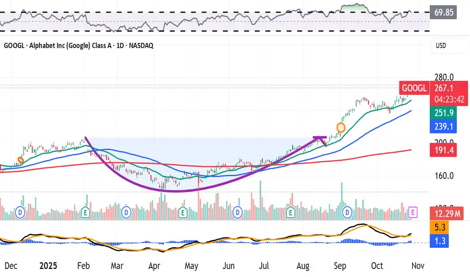 Readers will first note the large, well-defined cup-with-handle pattern that stretched from late January into August, marked with a purple curving line at the chart's center. That pattern provided GOOGL with a breakout in early September from a $106 pivot.