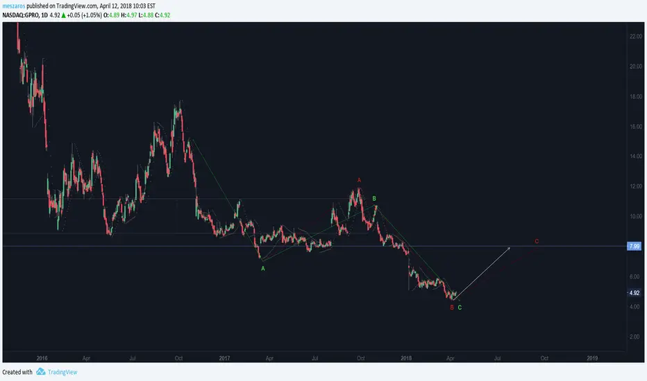 A flat wave wave structure. Slowly everybody gets tired of this continuous fall. The figure shows a "main wave" motion (green) and indicates a "response wave" (red). Both types have dual wave structure. The "Main Wave" (0A) section is 25 percent larger than the second (BC) section. The same can be said about the "response wave" structure. The "response wave" (0A) is 25 percent larger than the current waveform (BC) second wave structure. If it is correct the idea of the GPRO price is rising slowly, the target price is 7.99 usd.