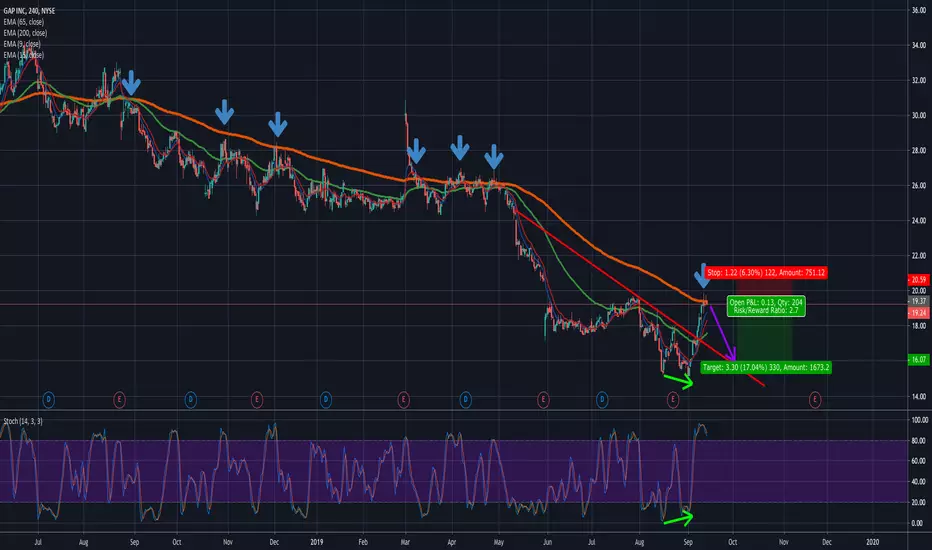 On the 4-hour chart of $NYSE:GPS, price action has interfered with the 200 Exponential Moving Average a numerous amount of times. And, almost every time it has, a reversal and price swing has occurred.
