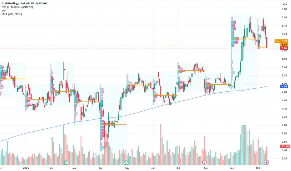 In the third quarter of 2025, Grab Holdings showed resilience despite economic uncertainty. The stock has moved largely sideways over the last 30 days, oscillating between the $5.50-$6 range but maintaining healthy volume activity. It is up approximately 8% year-to-date as increased revenue improvements have caught investor attention. The weekly price chart shows bottoming support dynamically near $5.35, aligned with optimism stemming from recent earnings that surpassed analyst expectations by 5%.