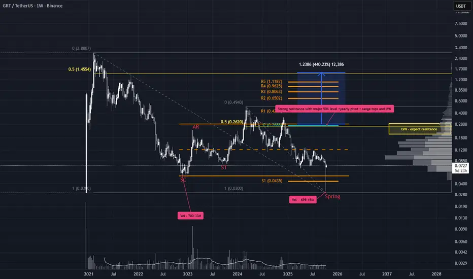 Despite the historic $20B crypto liquidation on October 10th, GRT’s wick printed on lower volume than the Selling Climax (SC), suggesting no need for a Spring retest. Price closed decisively back inside the range and above the yearly S1 pivot classic signs of smart money absorption.