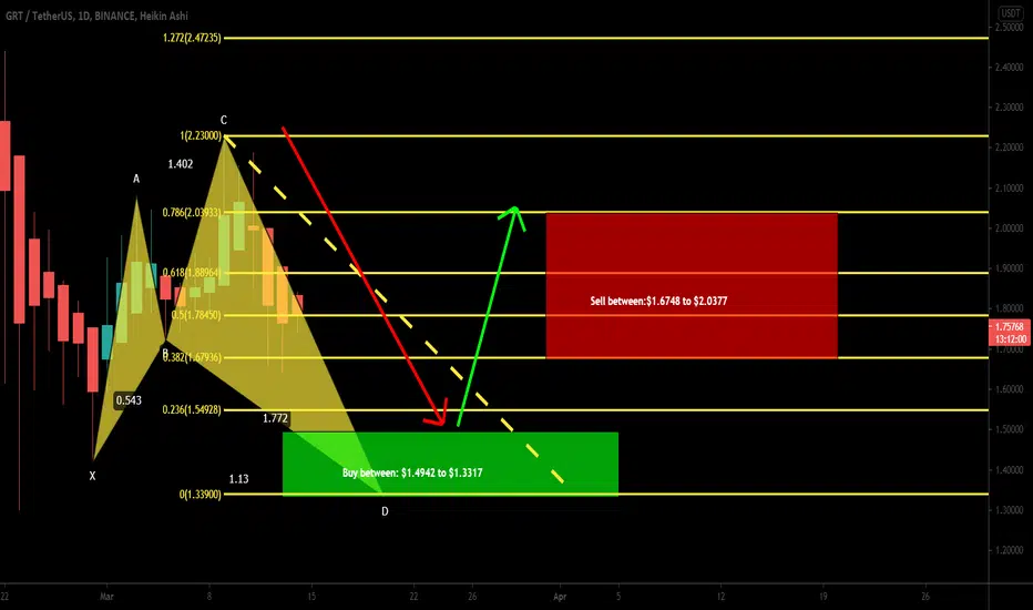 On the daily time period chart, the price action of the GRT is completing the last leg of the bullish Shark pattern and soon it will be entered the potential reversal zone.