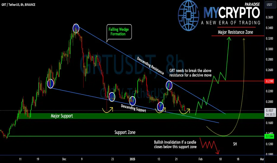 Yello, Paradisers! Are we about to witness a bullish breakout for #GRTUSDT, or could this falling wedge formation drag the price further down? Let's look at the latest setup of #TheGraph: