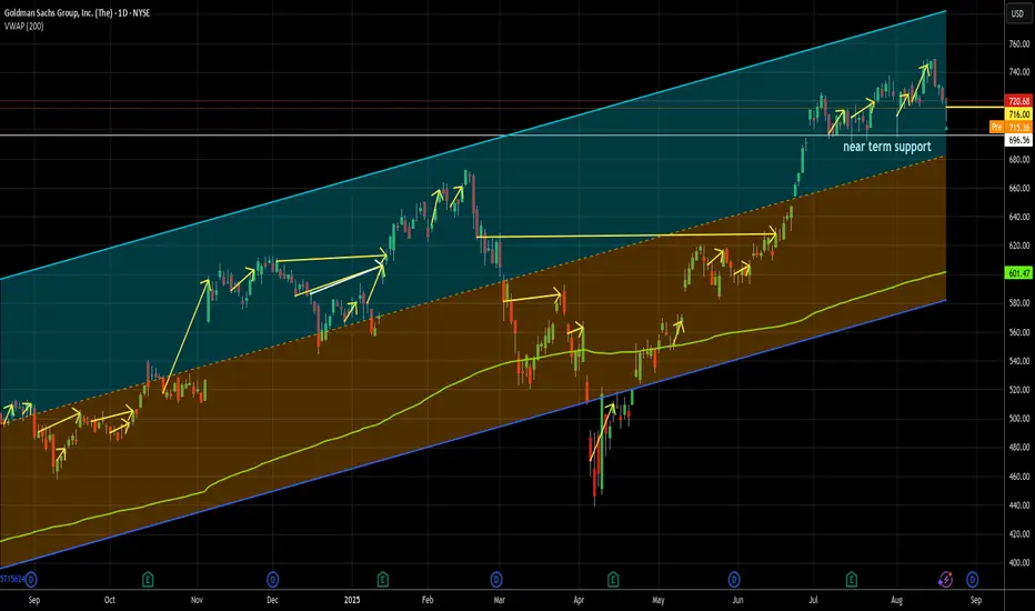 The market feels weak here, but the GS chart is very solid. It's well above its 200d VWAP, still in a solid uptrend and in the top half of its 1Y regression channel, indicating (at least at this point) it is correcting, not collapsing. It has support fairly close by as well from its early July lows and beyond that, from the Feb 18 high.