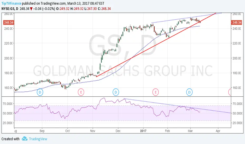 Bearish price RSI divergence followed by a breach of the rising trend line suggests the 50-DMA support of 243 could be put to test.