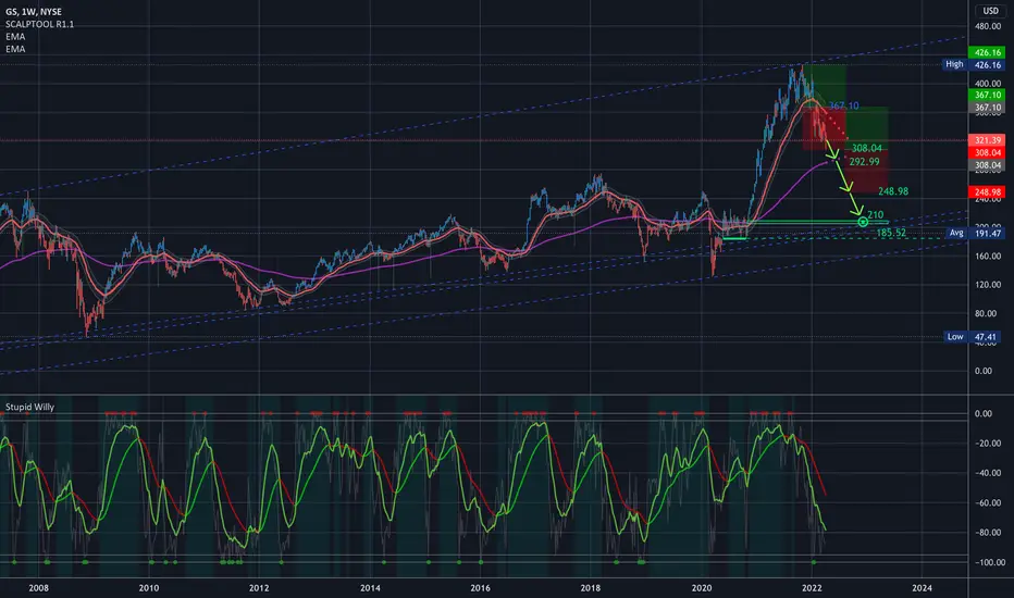 This is a very long view, taking GS from the bottom of 2008 until today…. I’m expecting another 35% drawdown from here, but not necessarily by the end of the year which I have pictured… I was just running out of room so I didn’t want to push it further out.