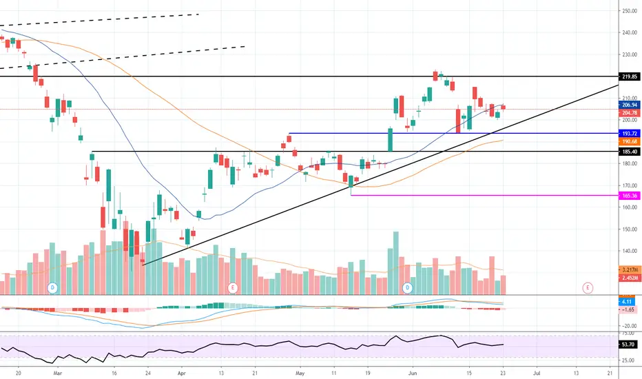 Small head & shoulders forming at the neckline of the previous of the larger head & shoulders? Struggling to hold above the 20 sma. If it can't reclaim soon & the downtrend continues, break of the blue line says we see $165 pretty quickly.