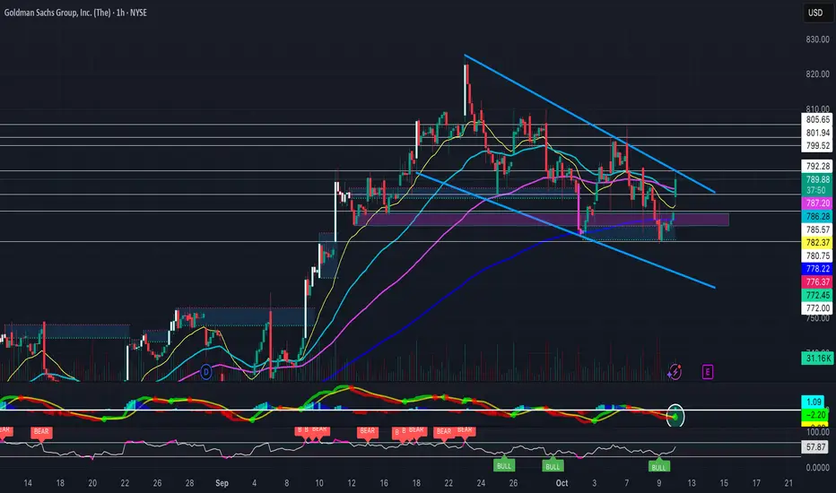 GS is holding yet another falling wedge heading into earnings next week. (Previous Chart Below)