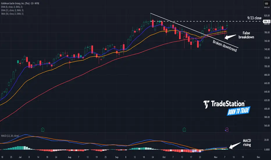 The first pattern on today’s chart is the series of lower highs between late September and late October. GS has spent more than two weeks above that falling trendline, which may confirm the slide has ended.