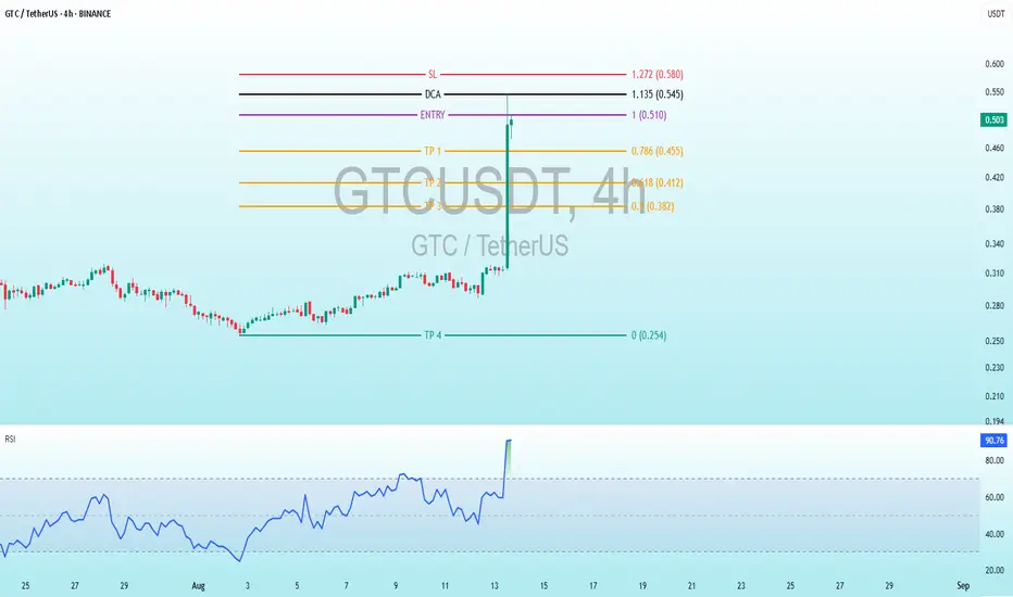Profit Targets: TP1 to TP3 are based on Fibonacci retracement levels (0.786, 0.618, 0.5), indicating a technical approach to securing profits incrementally. TP4 at 0.254 USDT seems unusually low and might reflect a long-term target or an error.
