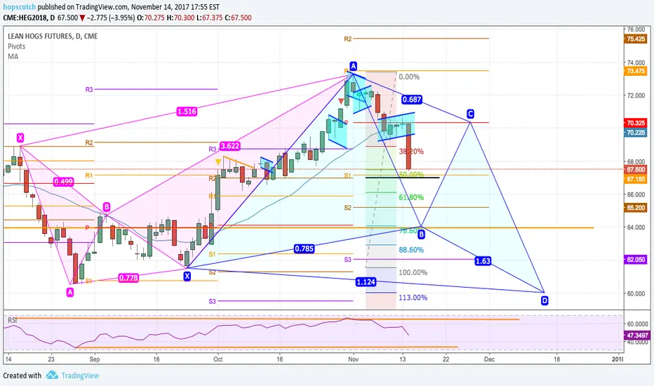 Hogs finished the day down. Target S1. Bullish Bat pattern in play. Not sure it will hit 64. if it can achieve S1 without any issues, then S2 is surely a potential target. There is an outside chance of a Butterfly, but I wouldn't hold my breath.Note