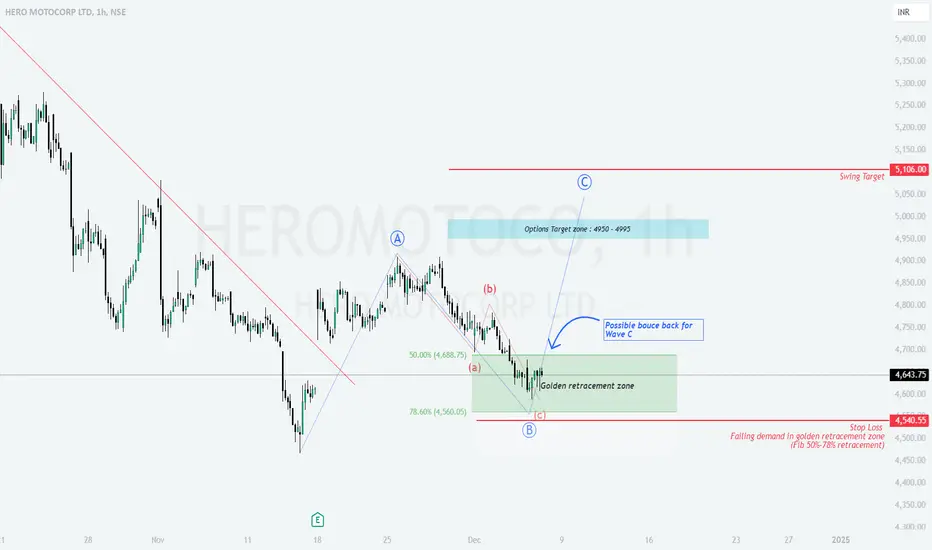 Enter between ₹4560–₹4688, within the Golden Retracement Zone for Wave C correction. Confirmation from bullish divergence or candlestick patterns is key.