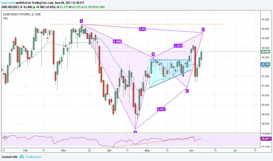 Hogs dropped off the Gartley yesterday and today. Hit uptrend line. Looking for a new direction Friday. May get a doji.Disclaimer