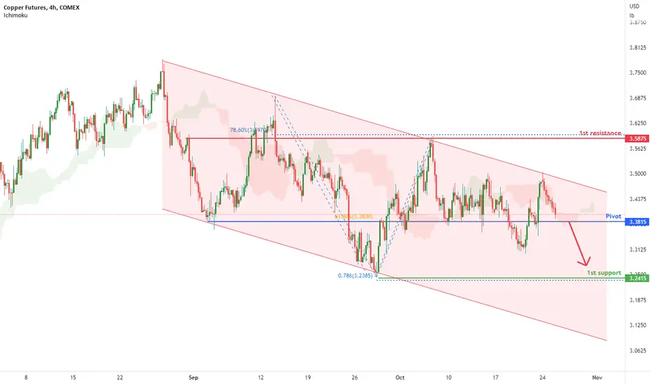 Preferred Case: The H4 price is in a downward channel and crossing below ichimoku cloud . The price may drop form the pivot at 3.3815, where the 61.8% fibonacci retracement is to the 1st support at 3.2415 where the swing low and 78.6% fibonacci projection sits