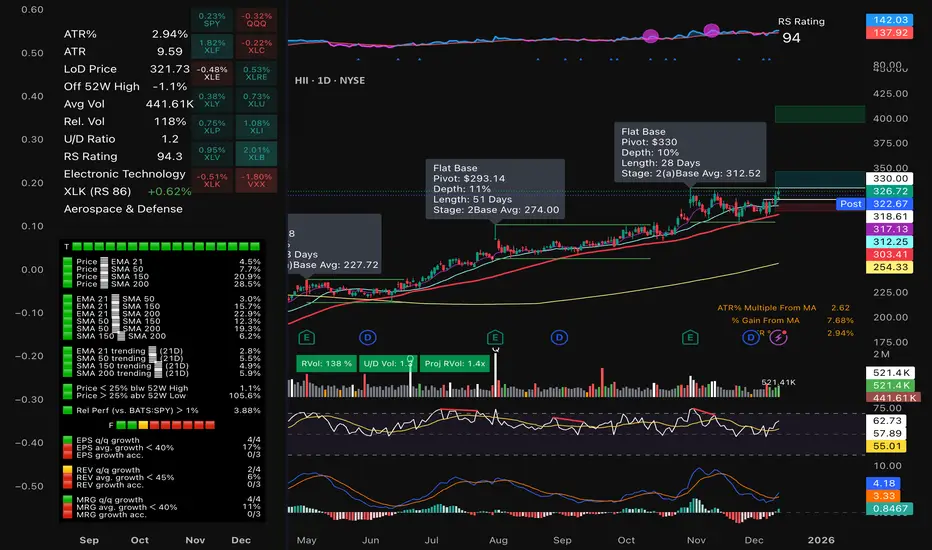 HII is forming a flat base just below all-time highs, within a high relative strength sector (Defense), as small caps and industrials rotate into leadership. Price is consolidating tightly near the $330 pivot with rising volume on up days — a classic pre-breakout setup.