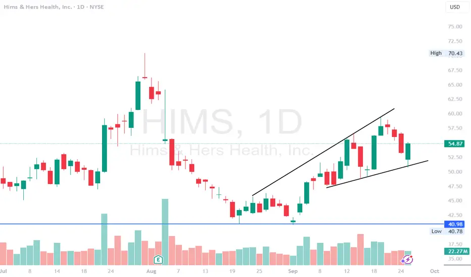 HIMS - Stock back up after hitting channel support. Possibly breaking move towards top of the channel at $65. calls above $55 looking good here. on high watch