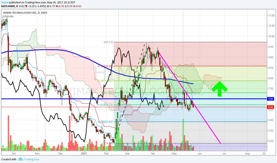 Will be looking for future bullish trend to start with HIMX. If you look at weekly chart, will see that $7.00 is a great Support once broken. Right now, PA is under noted PA trend line, 200 ma & noted cloud indicator. Fib. Ret retracement is at 0.618. At this time will wait for a bullish reversal setup.