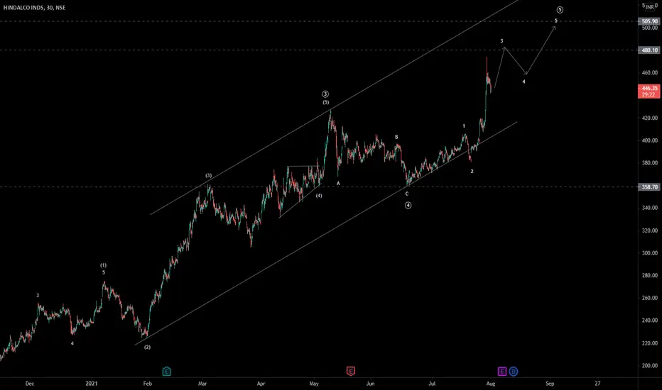 It is in 5th wave and expected to go for one more high after a three wave corrective pull back of internal degree. The target zone will be above 500 level.