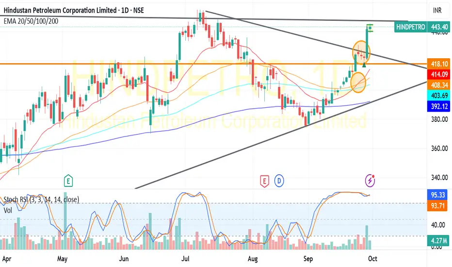 HPCL:Has formed a flag pattern in daily chart and also has given Golden DEMA Cross over -20 DEMA against 50/100/200DEMA in daily chart.