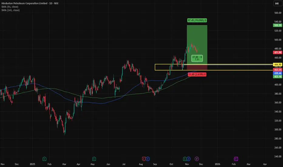HPCL shows a consistent upward momentum with a high-risk-reward trade setup, strong support around 431–444, and attractive profit potential.