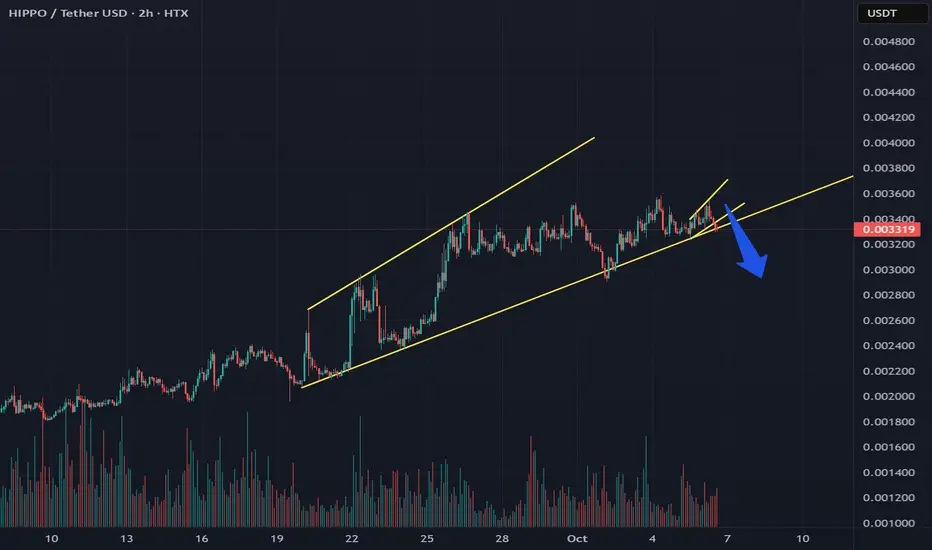 If the price breaks through, the pattern predicts a price move down to $0.0032 or lower