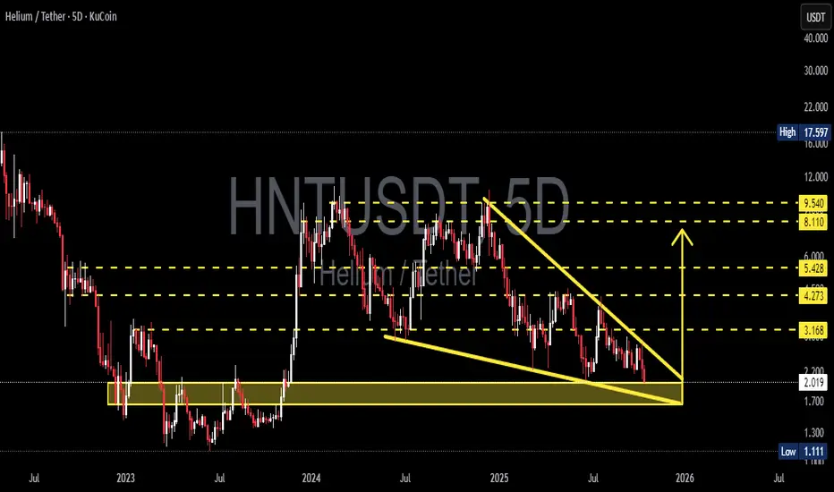 HNT is once again testing its major historical support zone between 1.70–2.02 USDT, a critical demand area that has acted as a price fortress since 2023. The chart is currently forming a Falling Wedge pattern, a classic structure that signals trend exhaustion and potential reversal.