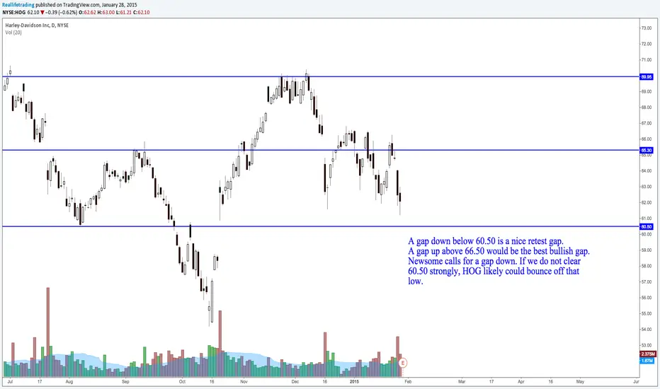Newsome calls for a gap down. If we do not clear 60.50 strongly, HOG likely could bounce off that low.