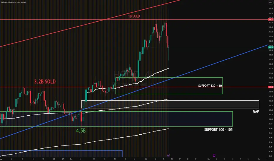 HOOD 4H — Clear rejection at 154–155 supply where heavy selling hit; price pulled back but still above the rising trend. Distribution evident near 154; prior absorption sits at 120–110 and again at 100–105. Watch the open gap around 110–108 if momentum fades.