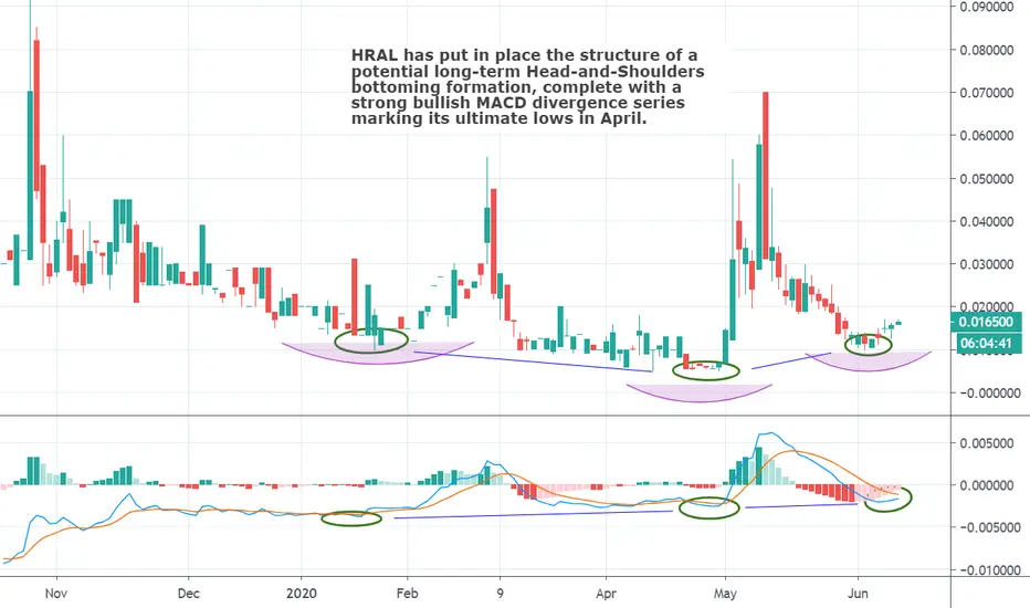 HRAL has put in place the structure of a potential long-term Head-and-Shoulders bottoming formation, complete with a strong bullish MACD divergence series marking its ultimate lows in April.