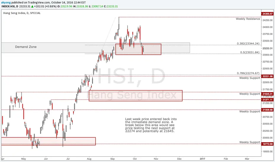Last week price entered back into the immediate demand zone. A break below this area would see price testing the next support at 22274 and potentially at 21645.