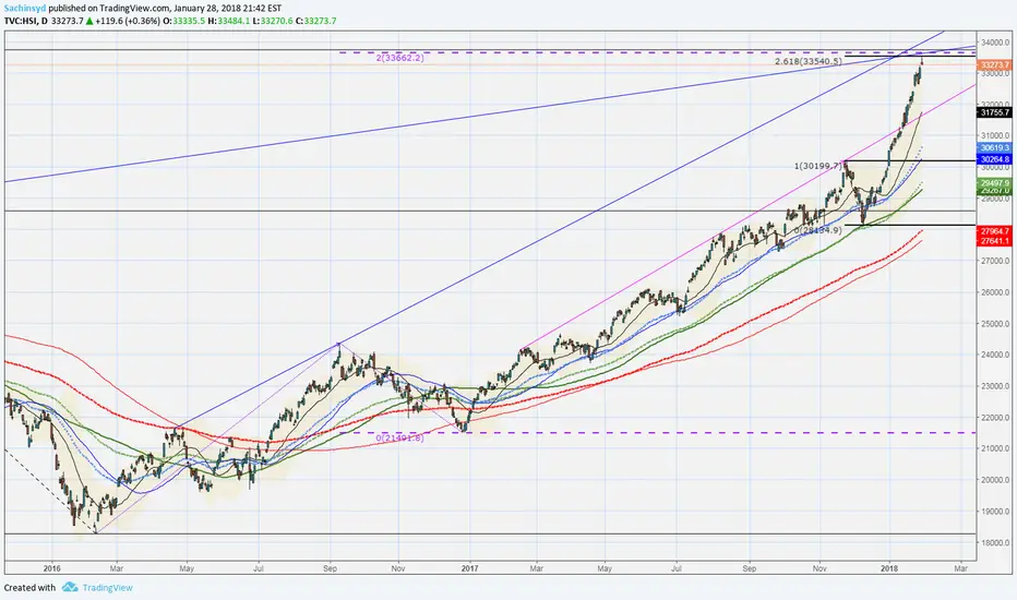 HSI into fib cluster likely to retrace down to 20dma where short term resistance line was breached. Short 33500-700 area