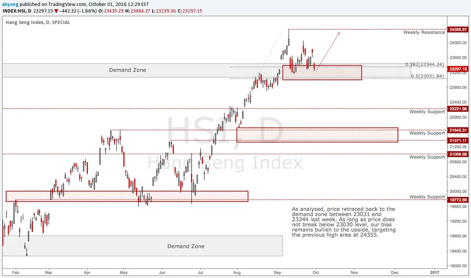 As analysed, price retraced back to the demand zone between 23031 and 23344 last week. As long as price does not break below 23030 level, our bias remains bullish to the upside, targeting the previous high area at 24355.