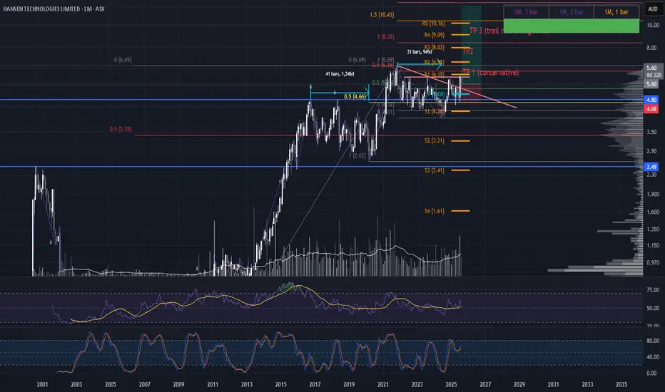 Hansen Technologies is shaping up as a compelling long-term play. On 20/08/25, a slight earnings miss (−0.07%) triggered a sharp intraday sell-off, with price spiking down to $5.00 before closing at $5.60, forming a bullish hammer. This candle reflects late retail capitulation into aggressive smart money absorption—a classic shakeout signature.