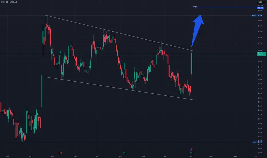 HTZ) is currently trading within a well-defined falling wedge pattern, a classic bullish setup that often precedes a reversal or breakout to the upside. After a period of consistent lower highs and lower lows, the price appears to be compressing near the wedge’s lower boundary, suggesting a potential exhaustion of selling pressure. The narrowing structure indicates that volatility is contracting, typically a prelude to a decisive move. If price action confirms a breakout above the upper trendline with solid volume, the pattern projects a potential upside target near $10, aligning with prior resistance levels and measured-move expectations from the wedge height. I’m monitoring closely for a daily close above the wedge resistance as a confirmation signal. Until then, the pattern remains in play, offering a constructive technical setup for bullish continuation.