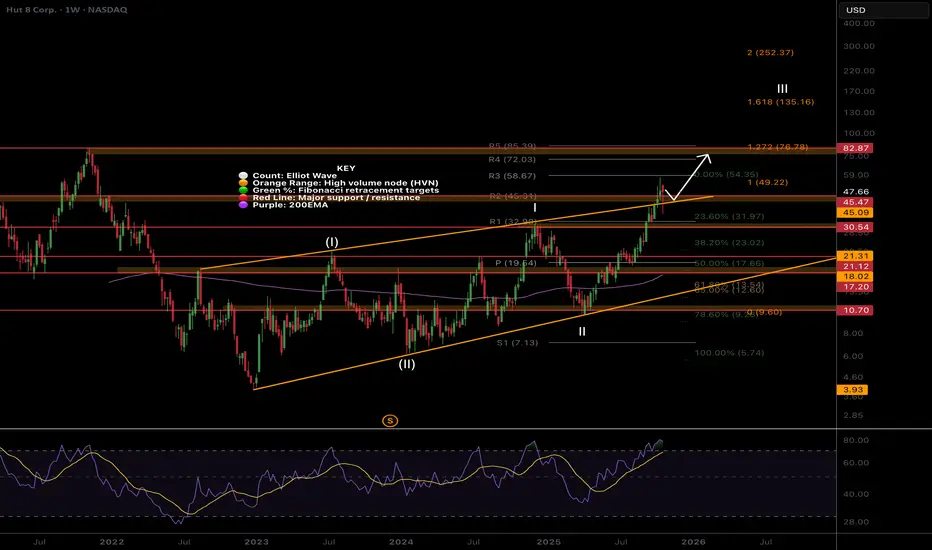 The Elliot wave count suggests a very bullish move come in wave III of (III) which would overextend the 1.618 target above, $200+.