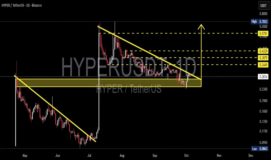 HYPER/USDT is currently trading inside a crucial consolidation zone (0.23–0.29 USDT) while being compressed by a descending trendline.