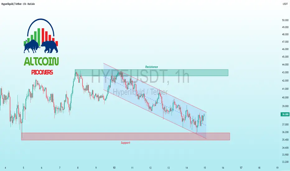 HYPER's probing the 35.5 support in this tight descending channel after a quick dump, with volume picking up on the hammer candle—early bullish reversal vibes.
