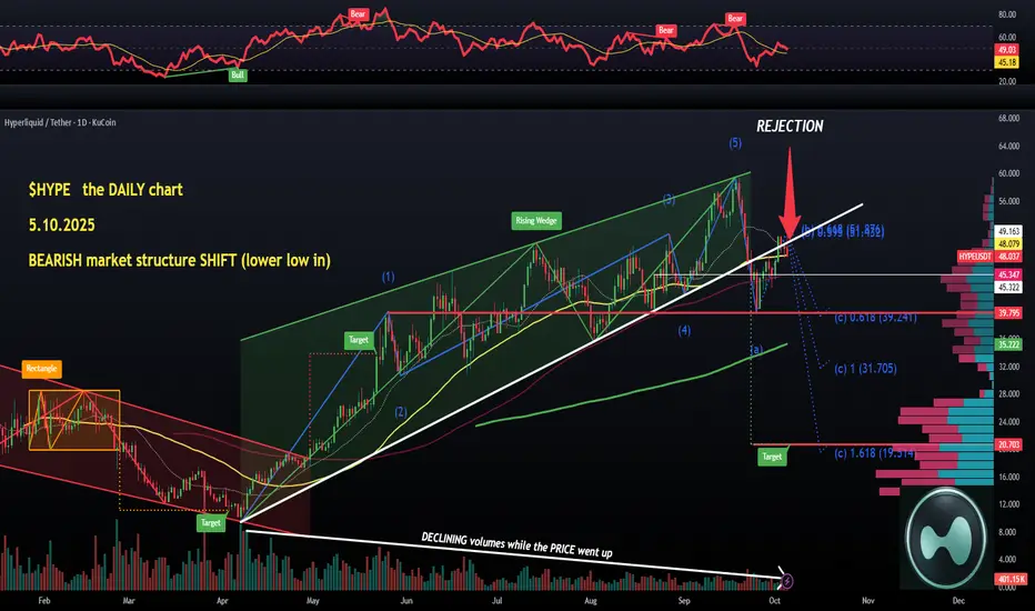 $HYPE (1-D): BEARISH market structure shift, RISING WEDGE retest