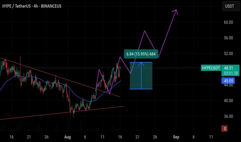 HHYPE/USDT is up 15% after breaking out of its wedge pattern, showing strong bullish momentum. Price is now eyeing the $50–$60 zone, with the setup remaining valid as long as it holds above $38 on the daily close.