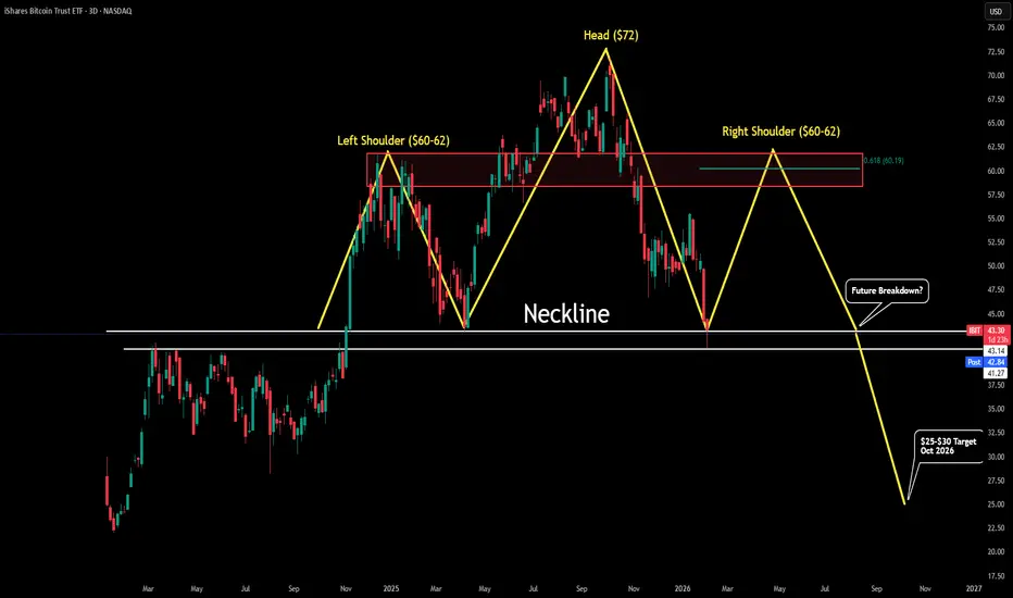 If/When IBIT breaks this "neckline" then we should expect price to head towards the $25-30 level. The very low was $22 but a sweet spot seems to be around $28. It all depends on how low BTC drops, but given BTC continues to respect its 4yr cycle theory we should also expect IBIT to behave in a similar way.