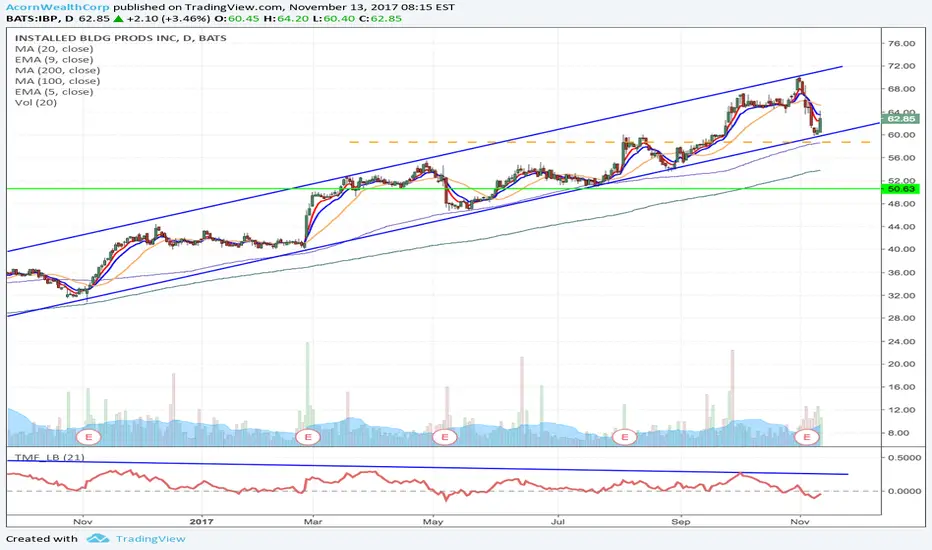 IBP is running within an upward channel breakdown. It has strong Twiggs moneyflow divergence. We think it has good downside potential.