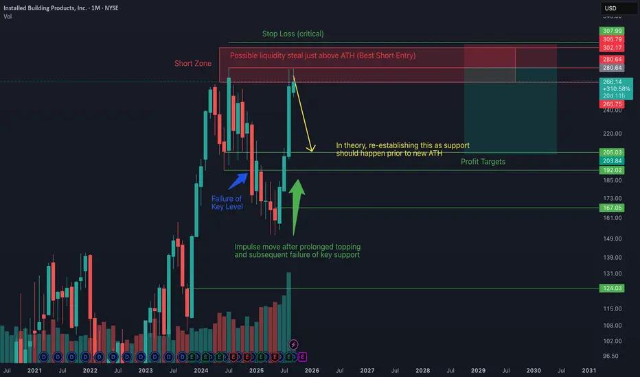 IBP is setting up for a lovely short on high time frames. After a prolonged topping, it lost critical support on the monthly, which would suggest a return to highs has a better than not chance of failure. A liquidity steal just above ATH would not surprise me, and I've place my biggest short orders there with a reasonable stop based on the r/r and my position size.