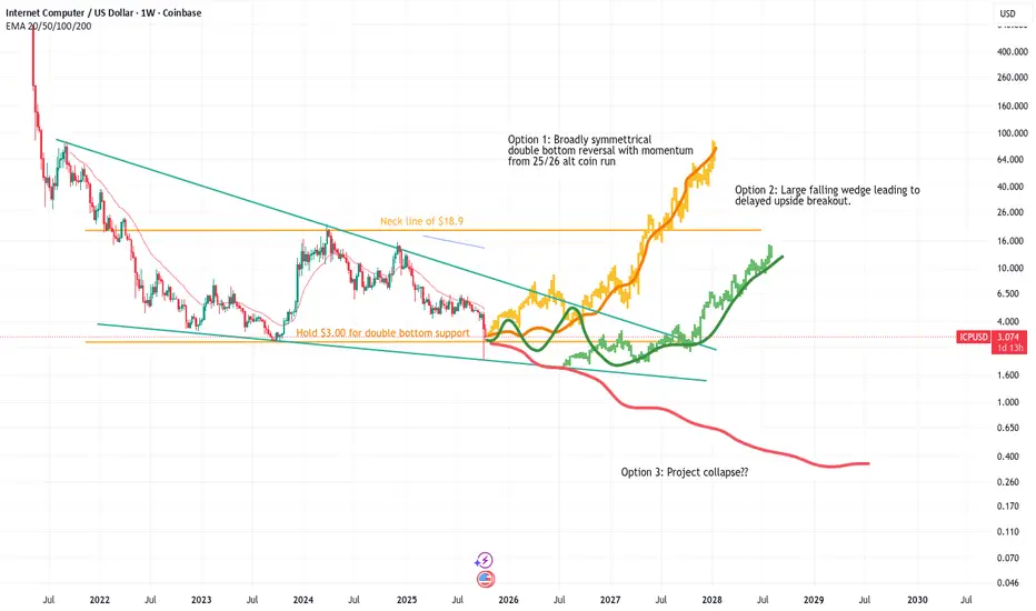 Is ICP in a large falling wedge? Will a failed retest of resistance at $6.00 during the next few months lead to a low around $1.00 to $1.50. If this is the case could it break out of the weekly falling wedge as momentum in the crypto market reforms in 2026/27?