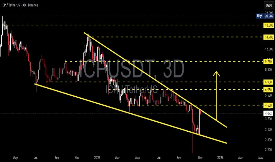 The ICP/USDT chart is currently displaying a highly critical structure as price continues to compress within a Falling Wedge pattern that has been developing since early 2025.
