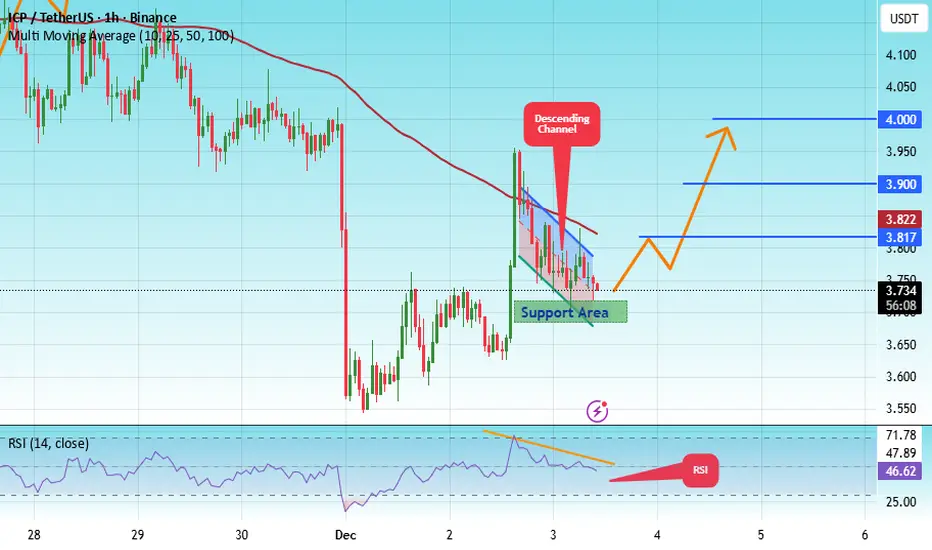 There is a key support zone in green at 3.70. The price has bounced from this zone multiple times and is expected to bounce again.