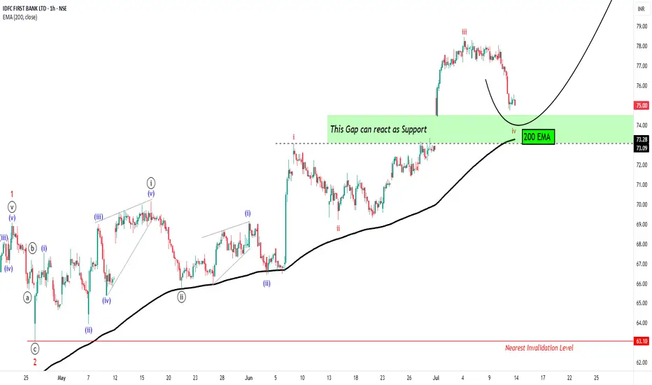 Today, we're analyzing the chart of IDFC First Bank using Elliott Wave theory. On the chart, we've marked the Elliott Waves, indicating that:
