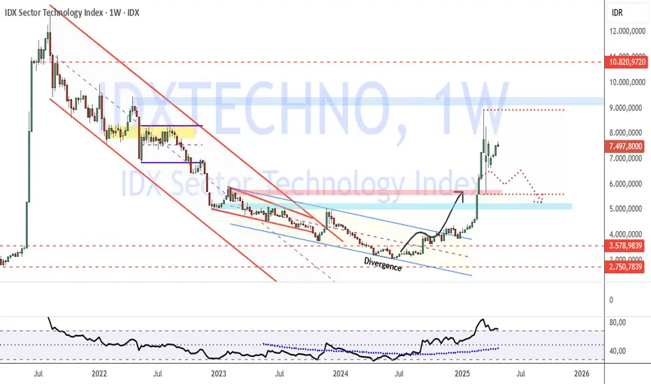 IDXTECHNO terlihat tertahan setelah naik cukup tinggi, berpotensi SIDEWAYS dahulu mengambil tenaga