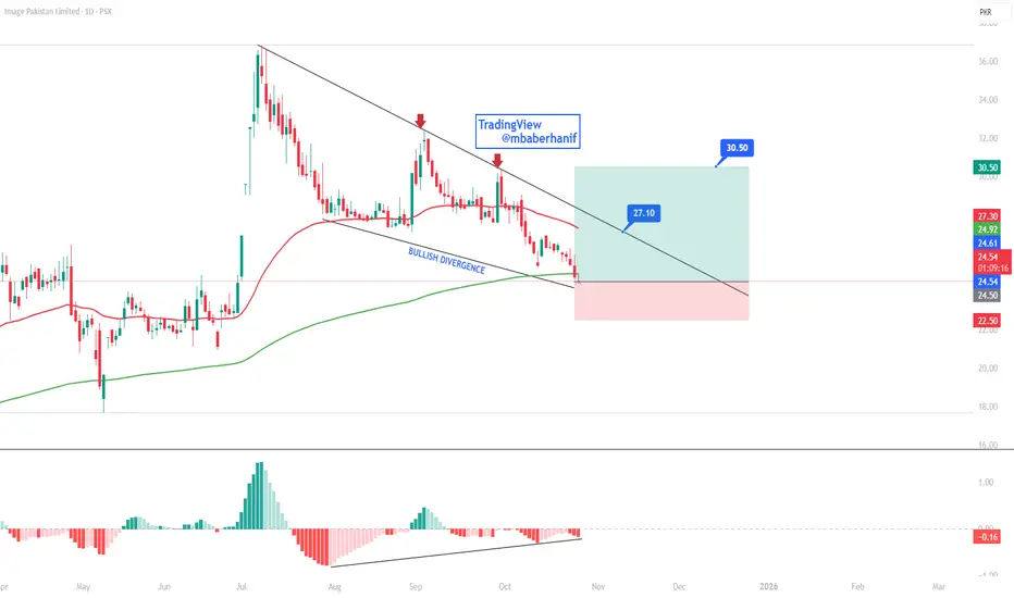 The stock is currently trading near its lower trendline support within a descending channel. A bullish divergence is observed between price action and the MACD histogram, indicating potential reversal momentum. If the price sustains above current levels and breaks the descending trendline, it may target PKR 27.10 initially and PKR 30.50 subsequently. However, a decline below PKR 22.50 would invalidate this bullish setup.