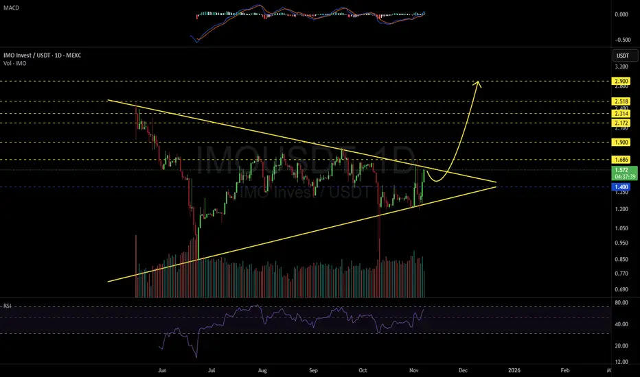 #IMO is currently trading within a symmetrical triangle on the daily chart. Wait for a clean breakout before entering this trade. In case of a confirmed breakout, the potential upside targets are: